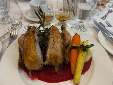 Cornish Hen stuffed with wild rice, apples and cranberries, basted with thyme maple butter served with brown butter mash, beet puree and heirloom carrots